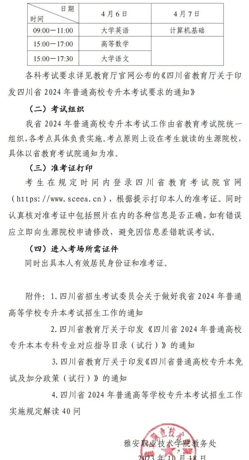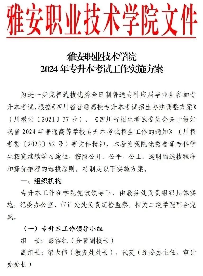 雅安职业技术学院2024年普通高等学校专升本考试实施方案的通知